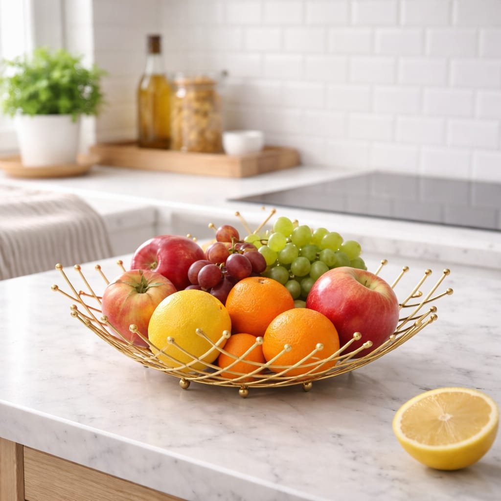Apportez une touche d’élégance moderne et ensoleillée à votre intérieur ! ☀️ Cette magnifique corbeille à fruits en fil métallique doré, au design unique et contemporain, est l’accessoire parfait pour sublimer votre table basse, votre comptoir de cuisine ou votre buffet.