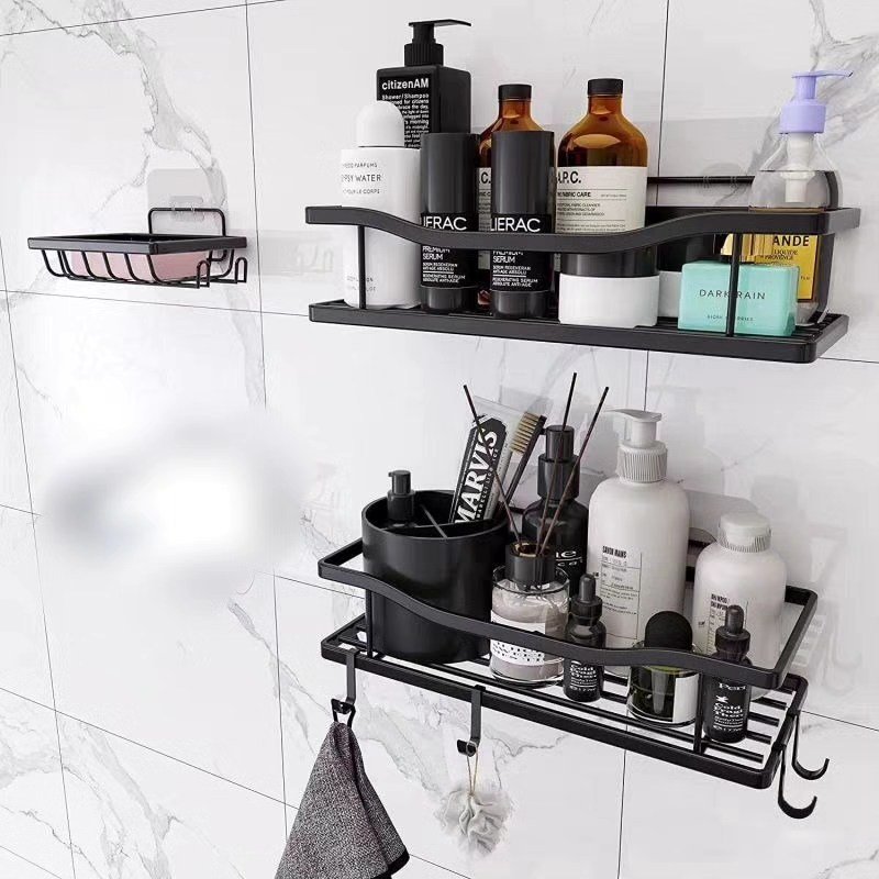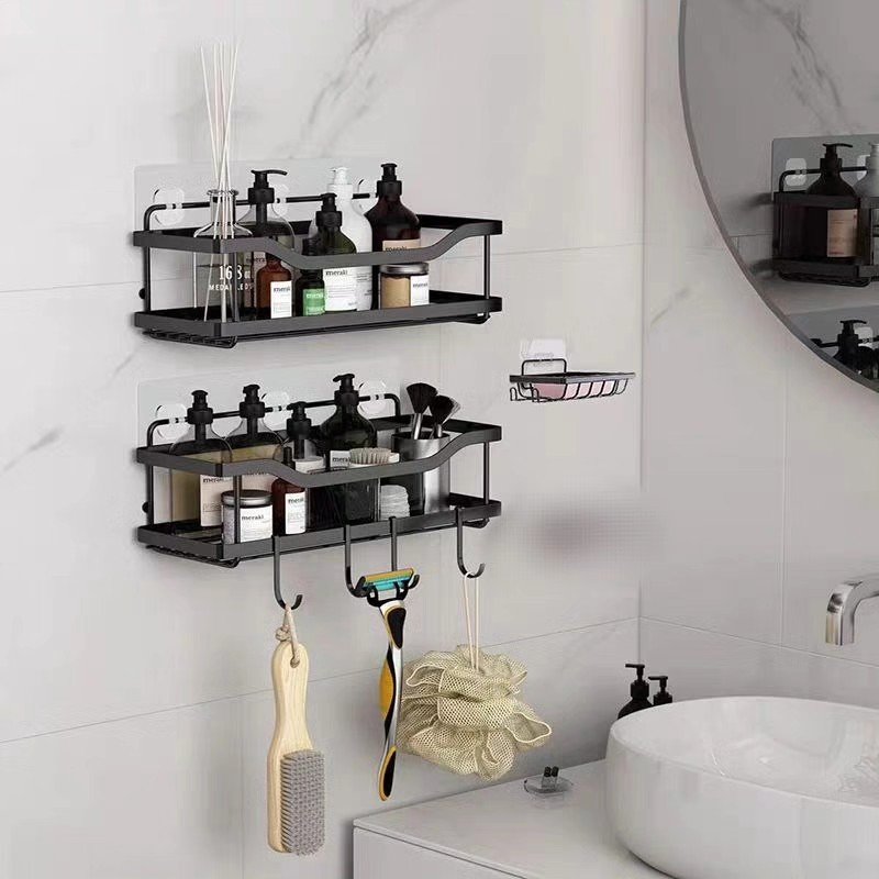 Set de 3 Supports de rangement métallique multifonction anti-rouille avec 3 crochets auto-adhésif sans perçage moderne et pratique pour salle de bain ou bien cuisine.